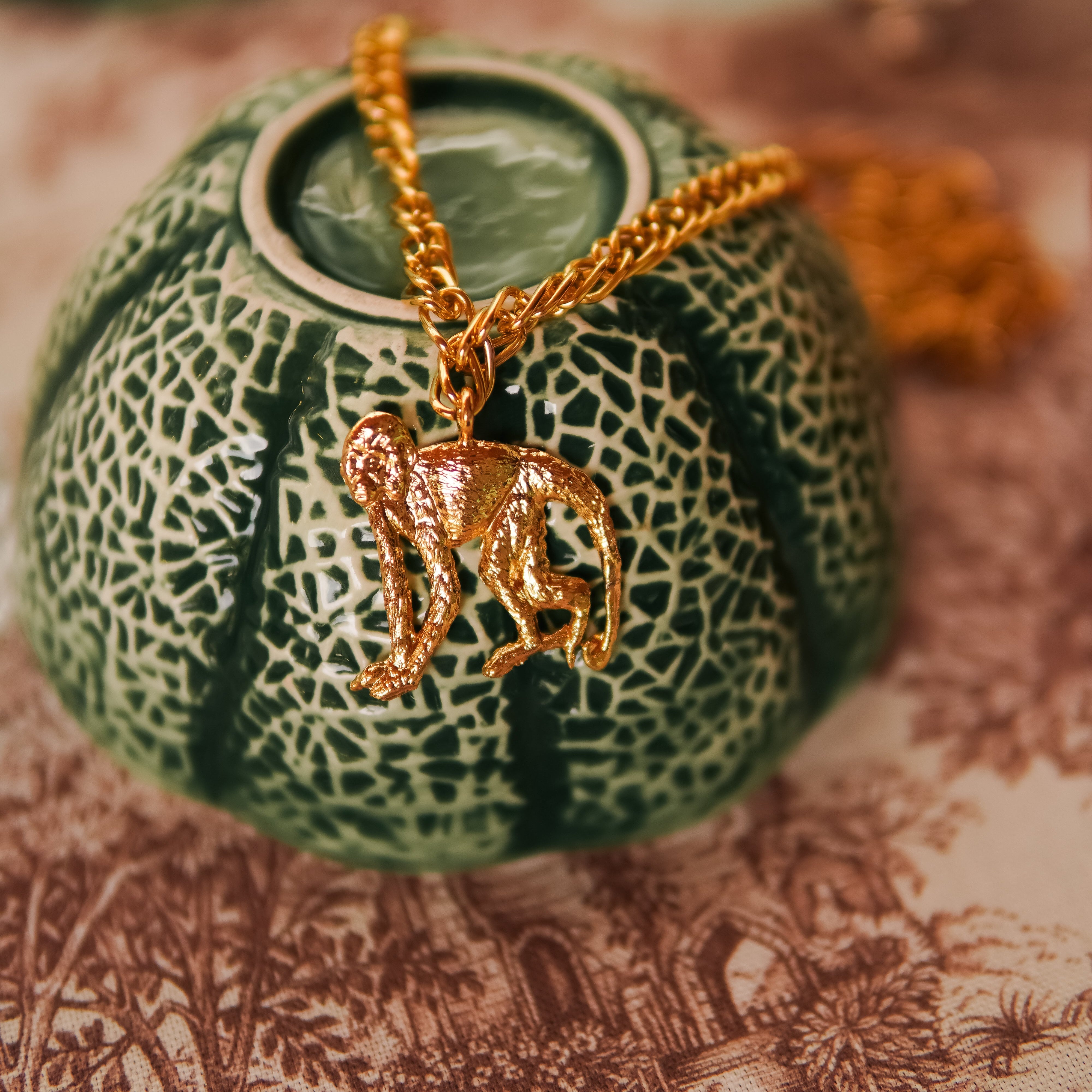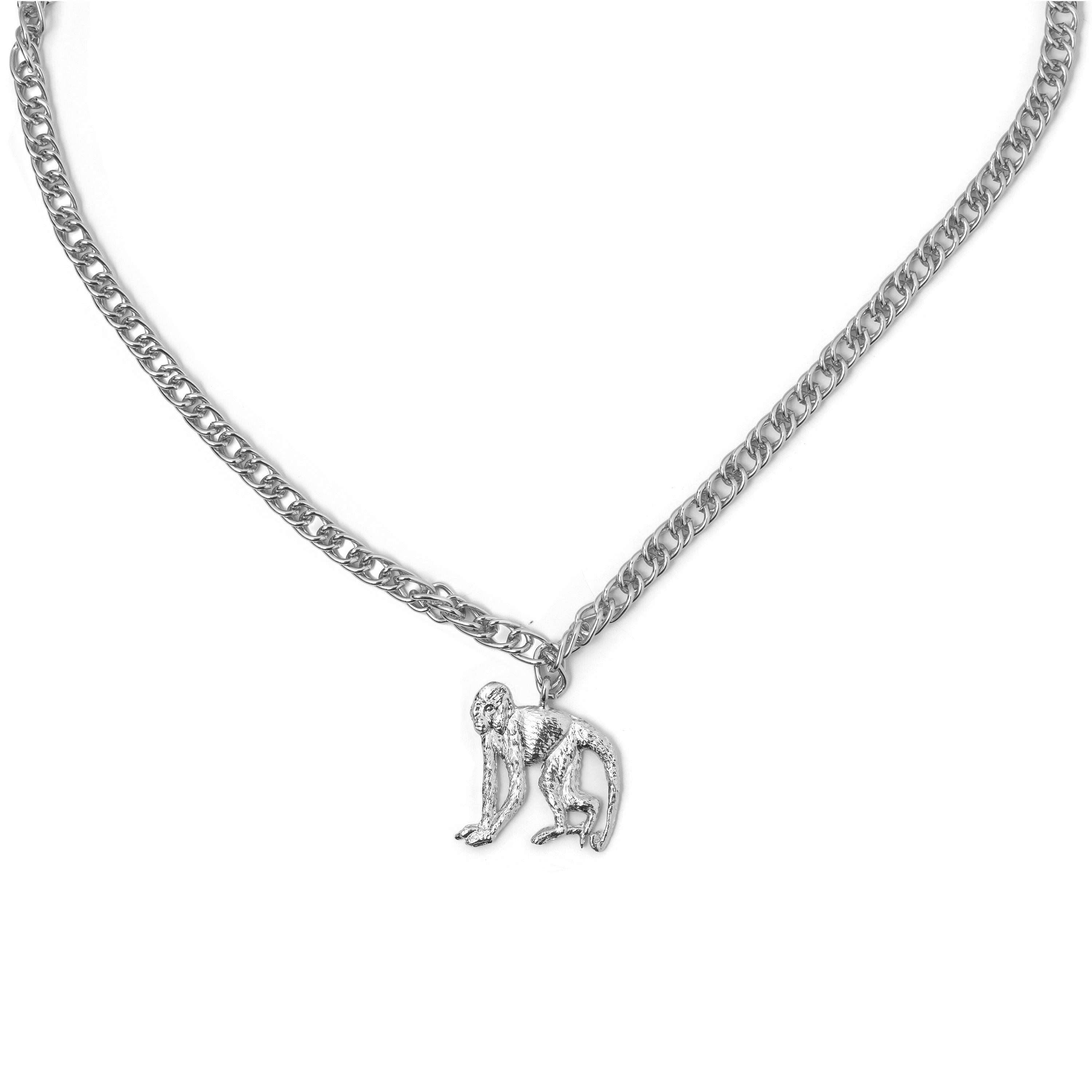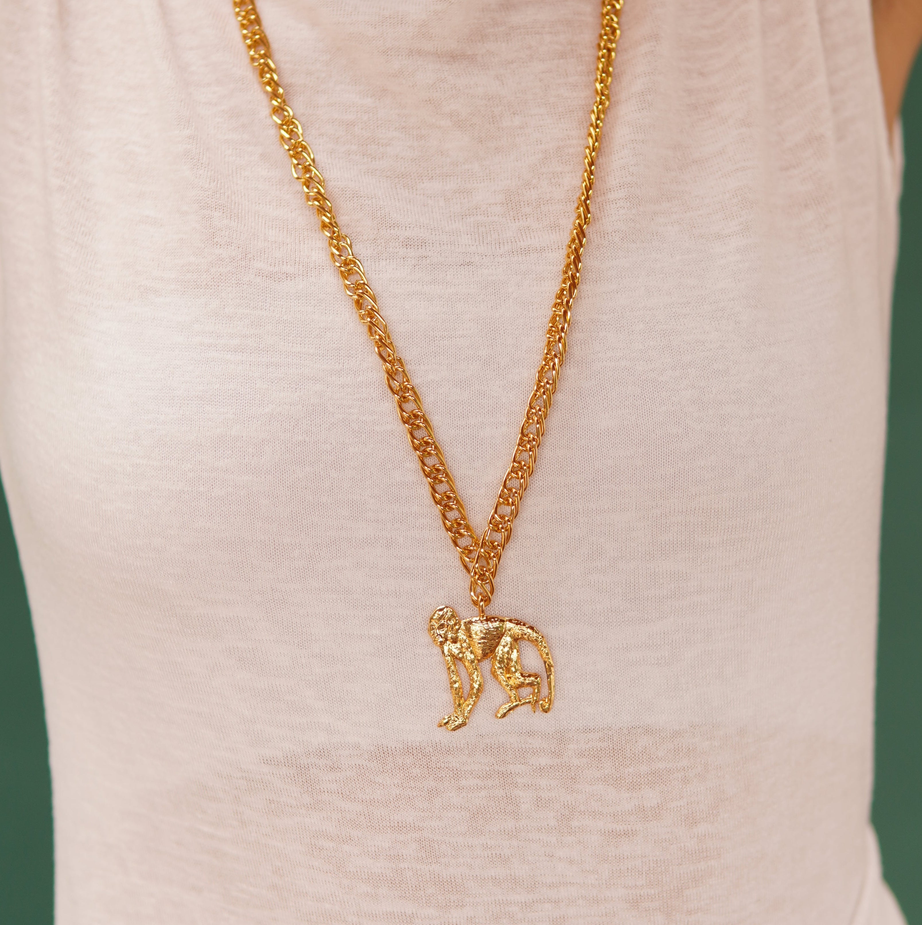 Nuestro Salvaje Necklace es un collar de cadena larga tejida y dije de mico, su tamaño mediano lo hace perfecto para usar en el día o la noche y robarse todas las miradas.